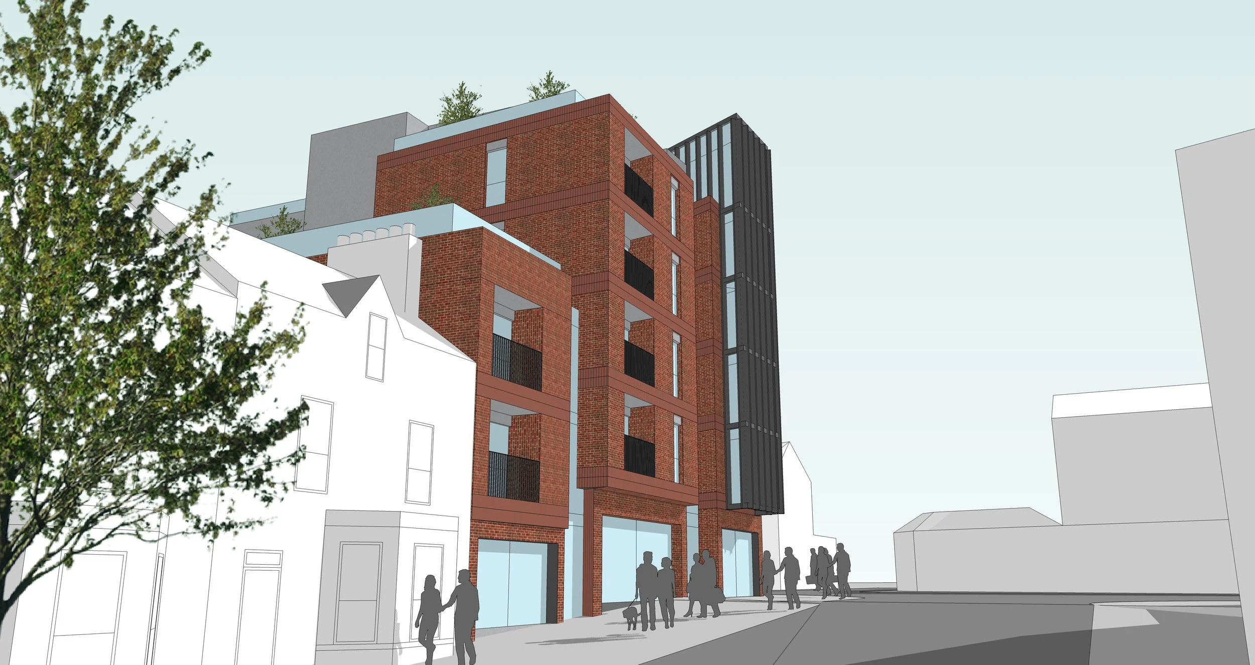 Originally designed as a private residential scheme, the client subsequently instructed the practice to revisit the design to meet rigorous social housing standards. This necessitated an internal redesign whilst maintaining the extant planning approval in collaboration with Choice Housing Association. Despite these challenges, the scheme delivers a high quality residential development for 23 no. apartments on a prominent brownfield site facing two main urban arterial routes and incorporates both private and shared amenity for each apartment. Currently under construction, the constrained nature of the site has required close dialogue with the client and contractor in delivering the project on budget.